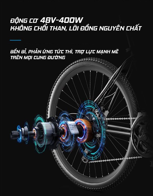 Động cơ trợ lực điện 48V400W không chổi than, lõi đồng nguyên chất, mạnh mẽ, bền bỉ, phản ứng nhanh nhạy, trợ lực mạnh mẽ trên mọi cung đường, luôn hỗ trợ bạn ngay khi cần.