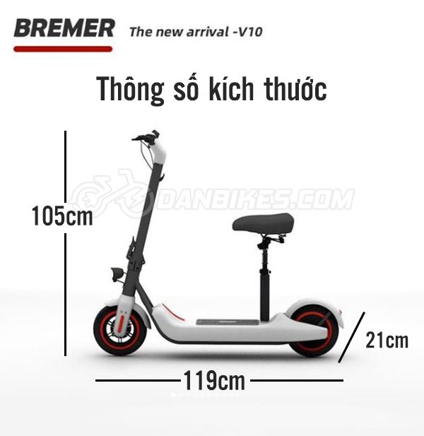 Xe Scooter điện Bremer V10 có trọng lượng khoảng 24 kg. Xe có chiều dài 119cm x rộng 21cm và cao 105cm và 119cm x 21cm x 51cm khi gấp gọn. Chiều cao yên xe có thể điều chỉnh linh hoạt, phù hợp với chiều cao của  người sử dụng