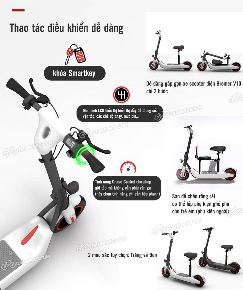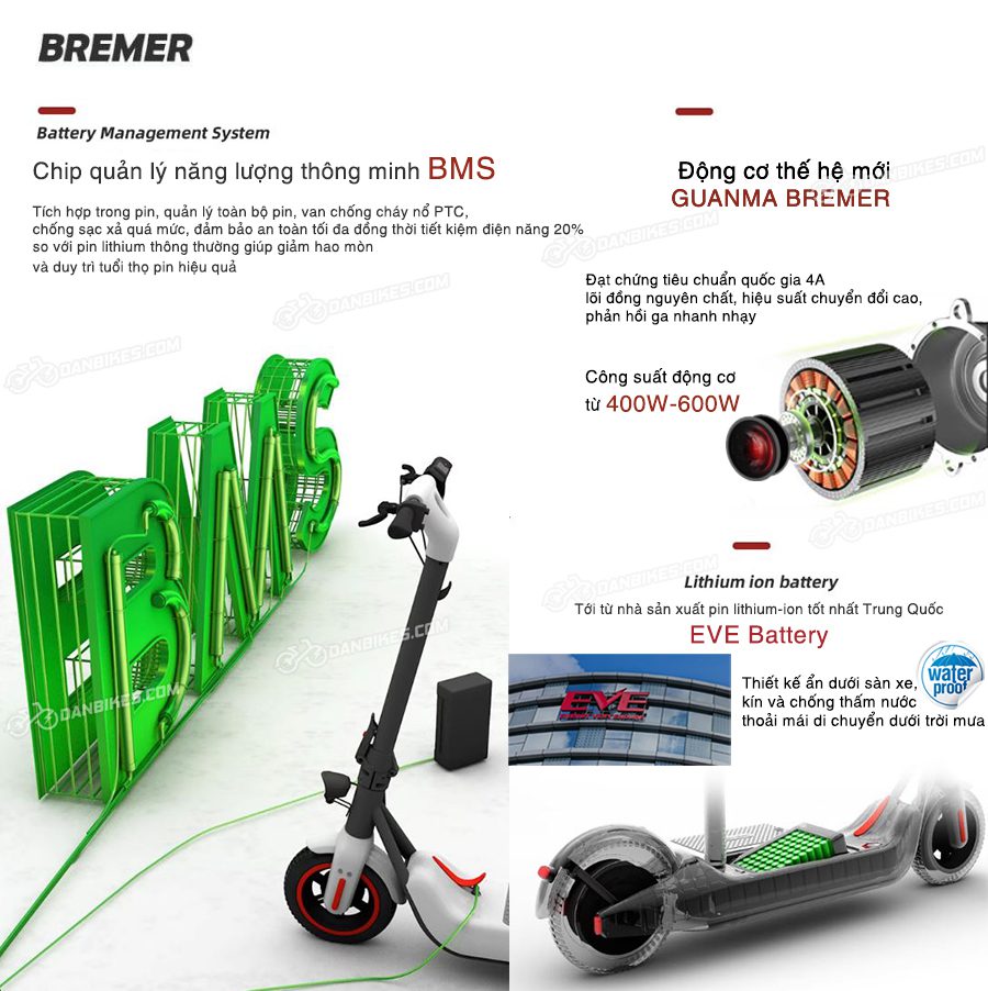 Xe scooter điện Bremer V10 là một chiếc xe scooter điện đa năng, gấp gọn, sở hữu thiết kế thời trang tinh tế , sử dụng pin Lithium ion từ tập đoàn EVE Battery - nhà sản xuất pin tốt nhất tại Trung Quốc Đại Lục, có thể dùng cho nhiều nhu cầu khác nhau như đi làm, đi học, đi du lịch,... dễ dàng bỏ trong cốp xe hơi, đi thang máy chung cư hay các phương tiện công cộng như tàu điện trên cao.
