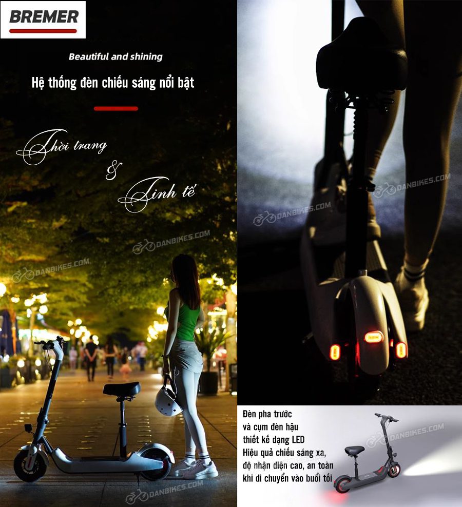 Xe Scooter điện Bremer V10 được trang bị hệ thống chiếu sáng LED trước và sau. Hệ thống chiếu sáng này giúp người lái nhìn rõ đường đi trong điều kiện thiếu ánh sáng.