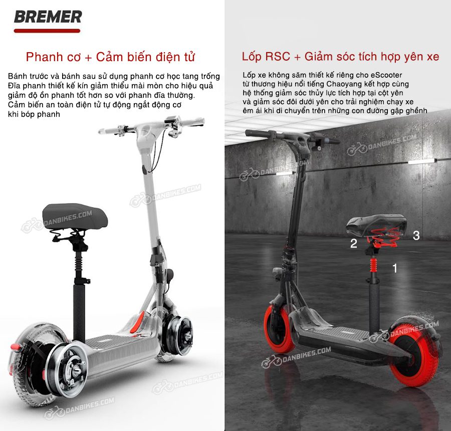 Xe Scooter điện Bremer V10 được trang bị hệ thống phanh đĩa cơ trước và phanh tang trống sau khép kín thiết kế mới giúp rút ngắn đáng kể quãng đường phanh, đồng thời đảm bảo an toàn cho người lái trong mọi tình huống.